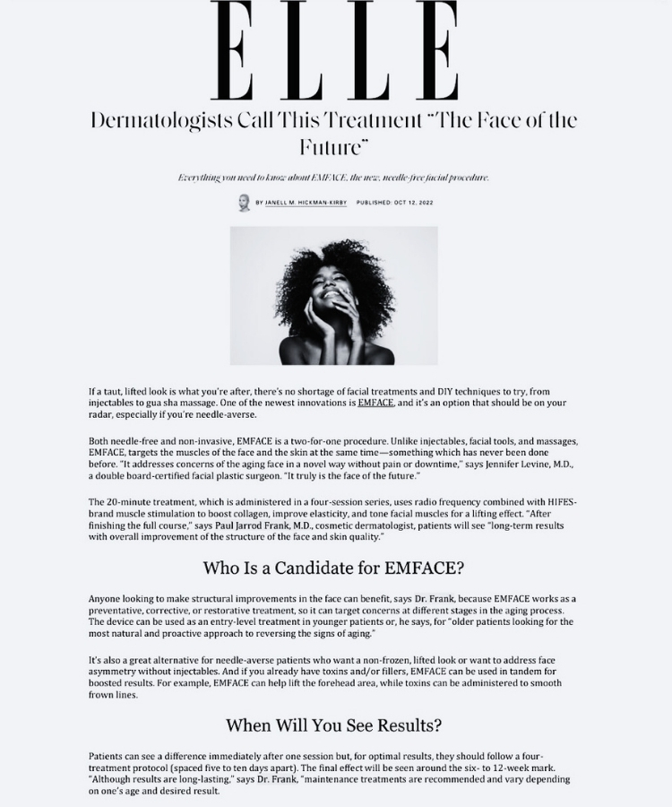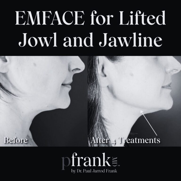 Ideal candidates for EMFACE Submental include individuals with light to dark skin tones, who desire a firmer, more youthful-looking lower face and neck but are reluctant or not a suitable candidate to undergo surgery. A consultation at PFRANKMD will ensure that the treatment is right for you.